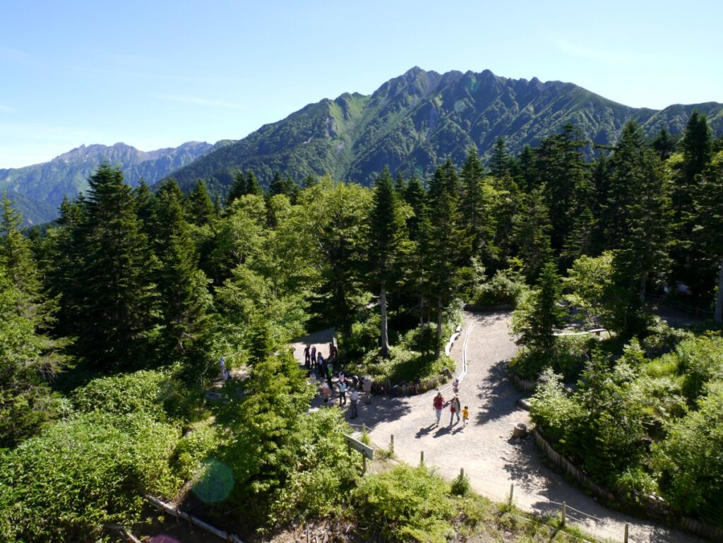 Just a short walk from Nishihotakaguchi Station at the summit is Itadakinomori, where you can experience the nature of the Northern Alps. Visitors can relax on the Yari no kairo deck and feel the mountains of Hotaka up close or sit at table benches surrounded by the vast natural beauty.