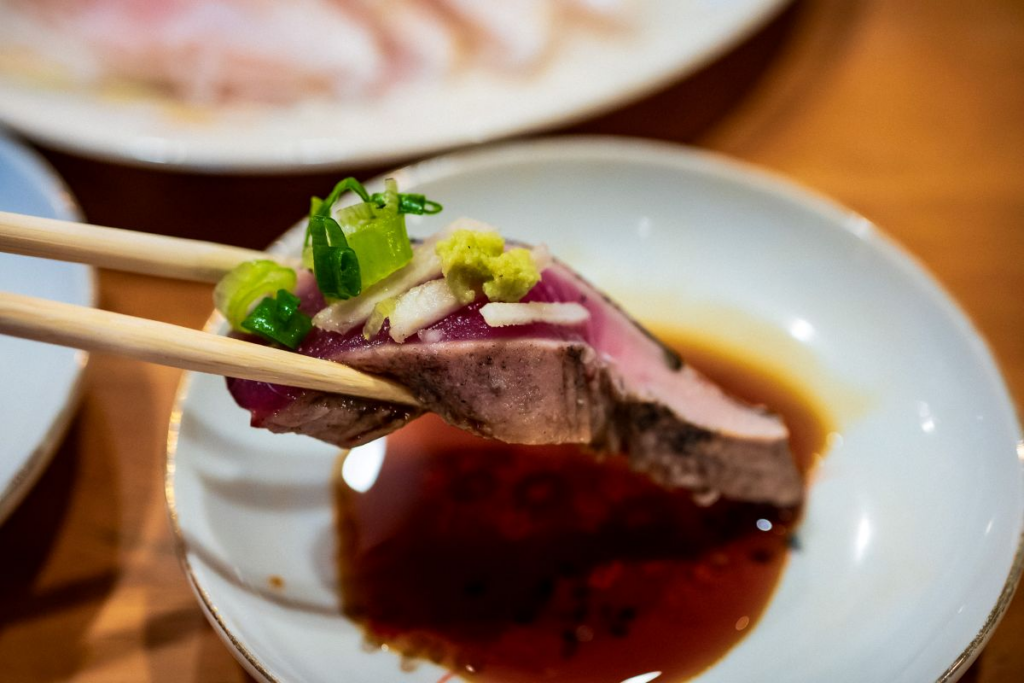 In Kochi, freshly caught katsuo is the star ingredient in one of the prefecture’s most famous dishes, katsuo tataki, a form of sashimi that has been slightly seared over a straw-fueled fire. The smoke enhances the flavor of the fish while the searing enhances the texture. Katsuo tataki is served on its own with simple condiments that can be combined to personal tastes: sea salt, garlic slices, wasabi, and ponzu (a light, citrusy soy sauce). The secret to Kochi’s katsuo tataki is in its freshness; the fish doesn’t have time to develop a fishy flavor when eaten so quickly after being caught.