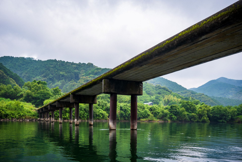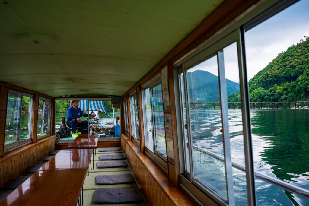 After getting off the train at Nakamura Station, the main station of Shimanto City, a 20-minute taxi ride takes you to Shimanto no Ao, a boat operating company offering various types of activities along the Shimanto River. The most common activity is a simple river cruise, which can be taken even without an advance reservation. The hour-long cruise takes you on a covered boat up and down the river, passing under two of the unique chinkabashi bridges that cross the Shimanto. These special bridges are designed so that when the river level rises above the bridges during heavy rains and typhoons, the bridges are not washed away.