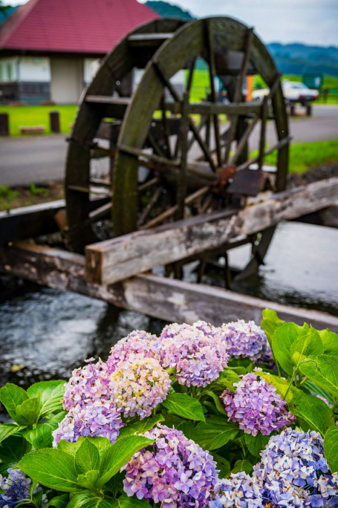 Historically, waterwheels of this type were constructed along artificial canals like this one to pump water into rice paddies, but over time, such structures were no longer needed and disappeared from the landscape. The Yasunami Waterwheels are maintained here by the local community, mainly for tourism and as a representation of the technology once used in farming. Nonetheless, they create a stunning view of life from another era, especially in late Spring when the hydrangea planted along the waterway burst into colorful hues of pink, purple, and blue.