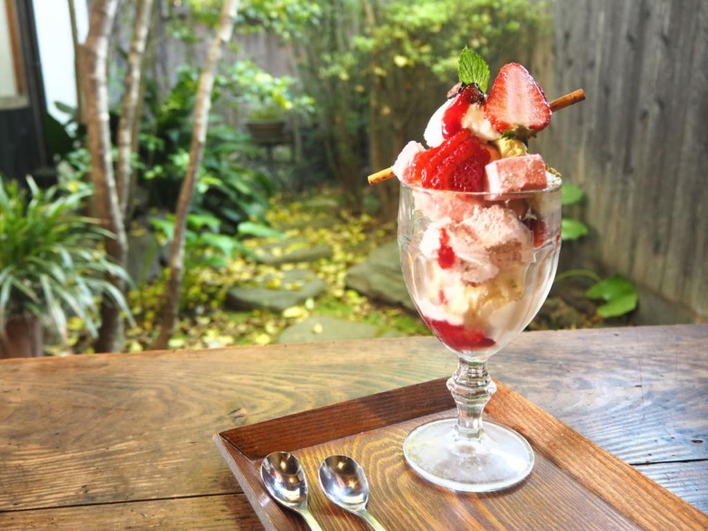 A quaint sweets shop with cakes, parfaits, and tasty drinks to complement them, perfectly located in Kurashiki’s old district, 15 minutes from the station. The area out back is shrouded in green, giving a beautiful backdrop to even more beautiful, handmade sweets. You wouldn’t know it from the outside, as the shop blends in among the rest of the rustic buildings, but inside you’ll find cozy, floor seating in the Japanese style, and a wooden interior that somehow has slight notes of jazz. The primary sweets master here has a keen sense, and focuses on the angle of presentation of the parfait, making them temporal and delicious works of art.