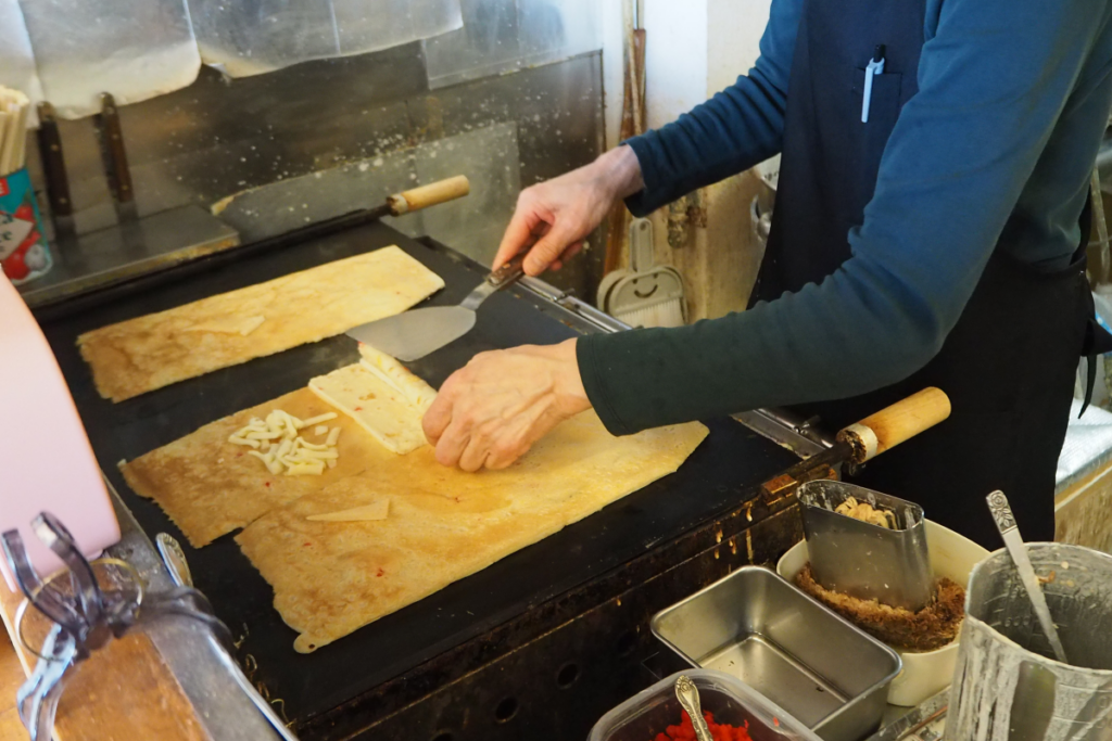 This locally conceived “junk food” ought to rival the heavy-hitting “takoyaki” from Osaka that everyone knows and loves. Similarly made from a flavored batter, this snack is grilled on an iron skillet, and rolled into what I could only call a “savory Japanese burrito”. Toppings like cheese, mayonnaise, spicy sauce, or just plain soy sauce give you many ways to enjoy this inexpensive bundle of carby goodness. It’s quite famous actually, and has been featured on national TV, with many of Japan’s TV personalities stopping by for their fill. And if you’re not busy, cheap drinks are served promptly from 5pm, spicing up the evening fun for locals and visitors.
