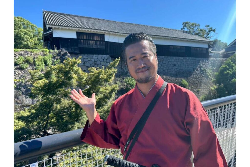 This is General Kato Kiyomasa. The General entertains our guests with his rich knowledge and love of Kumamoto (center).