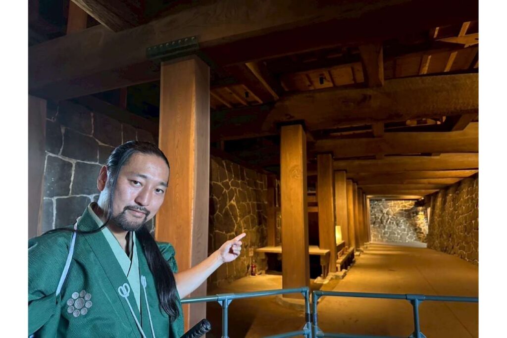 Up the stairs, take in views of Kumamoto city and the Aso mountains to the right and the hills that produced the stone for the castle walls to the left. Next, we move through to a prime attraction of Kumamoto Castle, the “Kuragari-Tsuro” underground passageway.