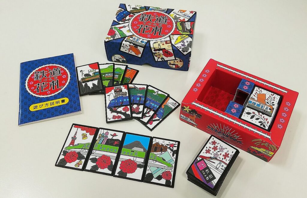 There are 48 cards, consisted of 12 months (suits) with 4 cards each. Each month is associated with the design of Japanese trains and seasonal flowers or plants. For example, March is associated with a design of Komachi train (Akita Shinkansen) and Cherry blossoms.