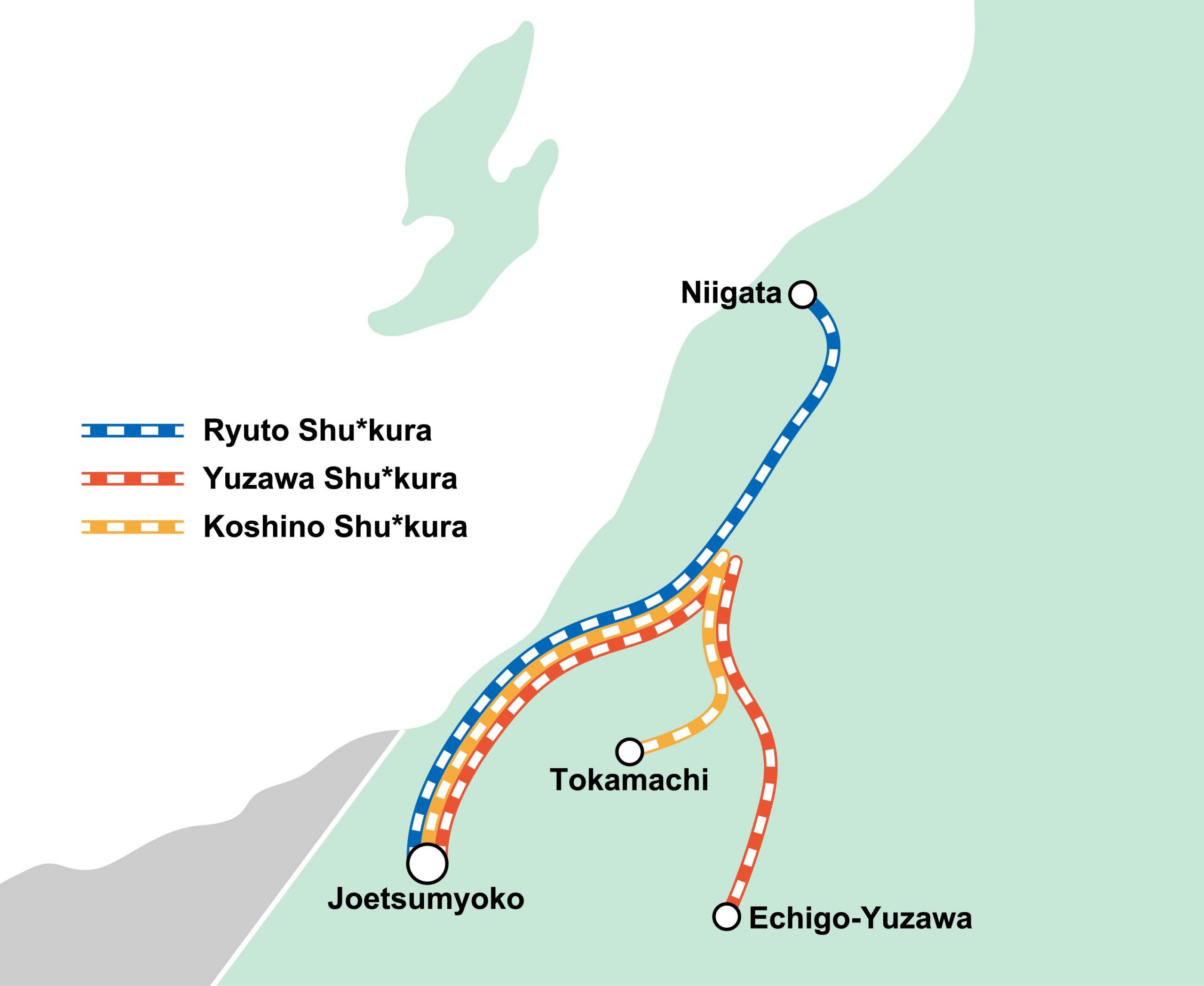The Koshino Shu*Kura is a train of Niigata, which is known as a major rice production area on the outskirts of Tokyo, and has a concept centered on sake which is made from rice. Niigata has numerous sake breweries as well as many well-known brands. The train cars were remodeled to evoke the sake breweries and abundant nature of Echigo. The name “ShuKura” written in English letters means sake brewery in Japanese, and the * symbol in the middle evokes the Japanese character for rice (米), snow crystals, and flowers. The Shu*Kura trains are divided into three named trains with different operation sections.