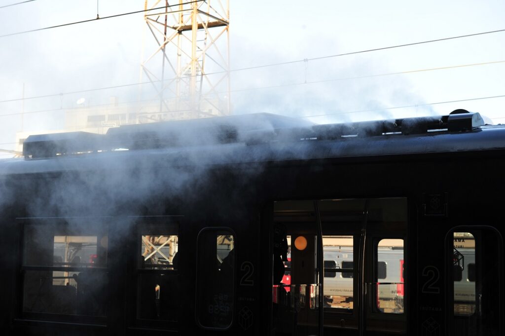 When the train stops at a station, white smoke pours from the top of the doors which resembles the part of the legend in which smoke comes out of the tamatebako (meaning jeweled box) when it is opened.