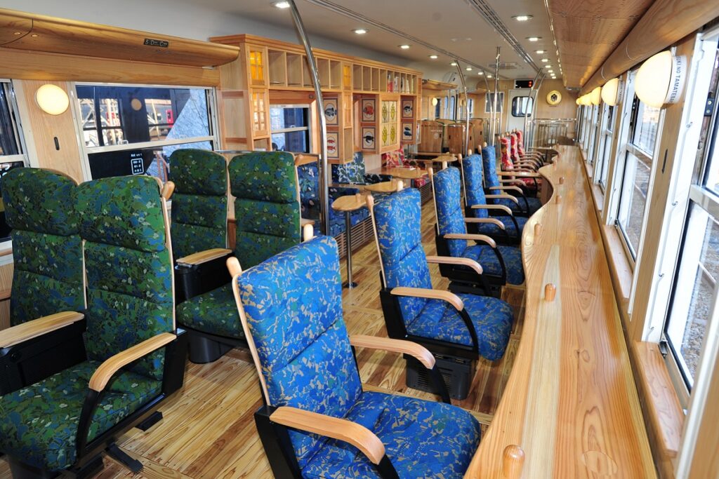 The comfortable train interior features an abundance of wood materials such as cedar and teak. It also has facilities to help provide pleasant journeys to passengers of all ages, including kids’ chairs, playpens, and books.