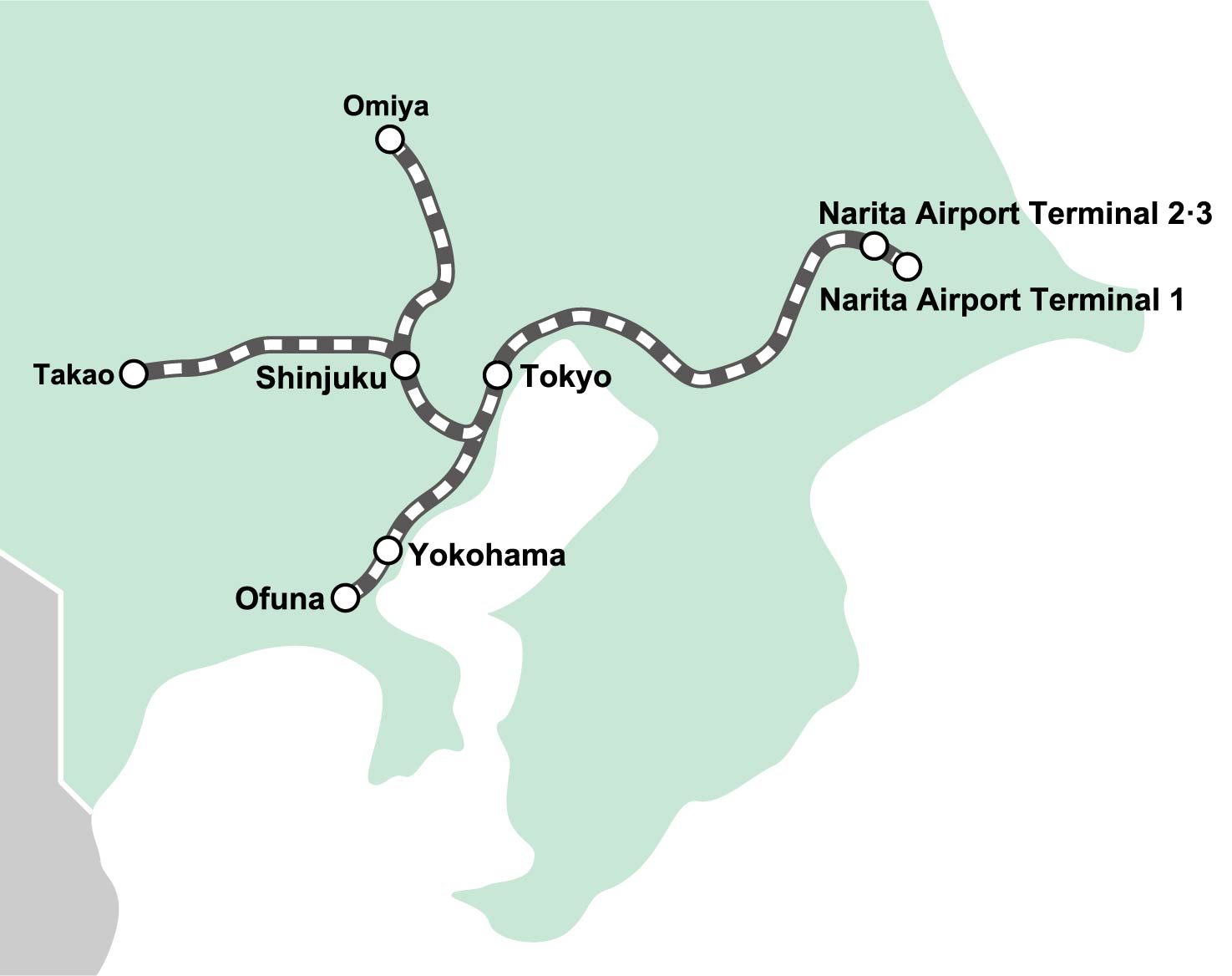 You can directly access popular areas like Shibuya, Shinjuku, and Yokohama by riding this train. All seats are reserved, so purchase your ticket with a seat reservation after you arrive at Narita Airport. If you have the Japan Rail Pass or the JR East Pass, you can reserve a seat without an additional charge.