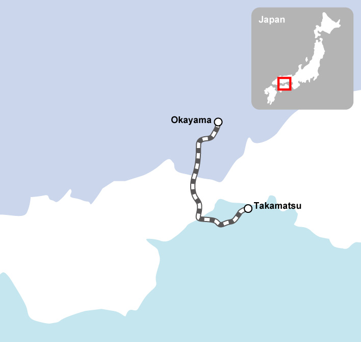 Shikoku is the smallest of the four main islands in the Japanese archipelago, and there is an inland sea – called the Seto Inland Sea – between Shikoku and Honshu. As suggested by its name, the Rapid Marine Liner serves as a link between Honshu and Shikoku by traversing the Great Seto Bridge that spans the Seto Inland Sea.