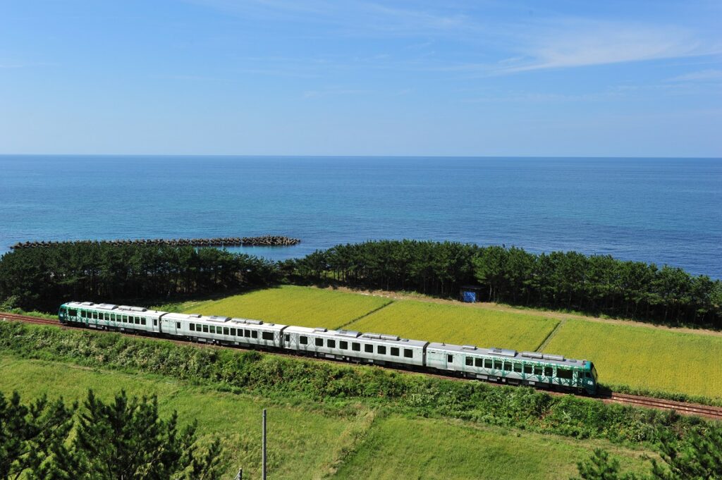 The Resort Shirakami is a sightseeing train that runs on the Gono line, with views of Shirakami Sanchi, a registered World Natural Heritage site, and the beautiful Sea of Japan coastline.