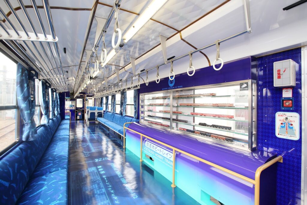 In addition, the train has two converting seats actually used in the 0-series shinkansen, as well as displays of various sizes exhibiting model trains of historic shinkansen and trains associated with Shikoku.