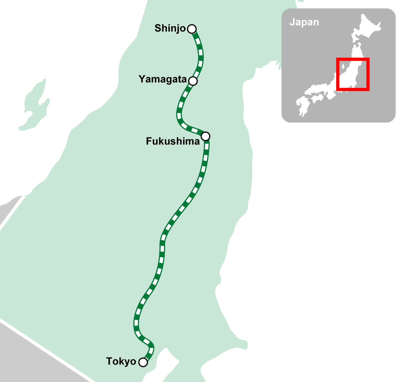 The Yamagata Shinkansen is a JR East train that connects Tokyo Station to Yamagata Station and Shinjo Station. Between Tokyo Station and Fukushima Station, the trains operate together with the Tohoku Shinkansen, with the exception of some trains.